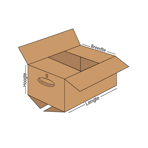 In de breedte van de doos komt dan links en rechts gecentreerd een handgreep op ongeveer 65 mm van de bovenzijde van de gevouwen doos.